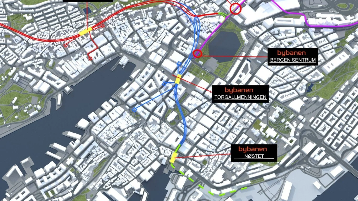 Blå linje: Anleggstunnelen som senere kan brukes for å forlenge Bybanen til Nøstet og Dokken.
